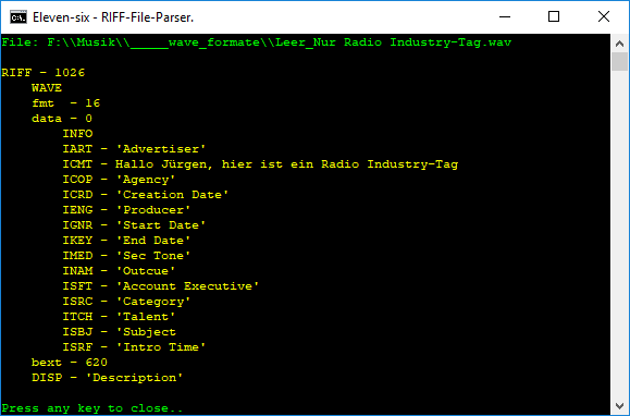 Kleines aber sehr nützliches Kommandozeilen-Tool, welches in übersichtlicher Darstellung die interne Struktur Ihrer Riff-Dateien ausgibt.